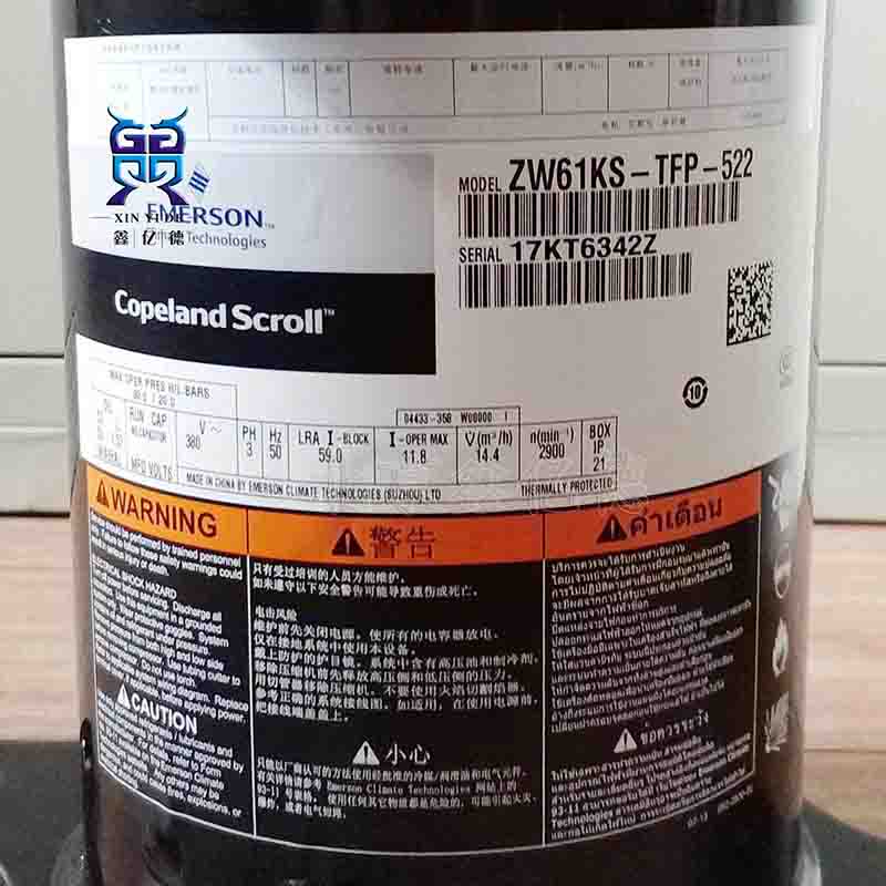 Copeland谷轮ZW61KS-TFP-522是一款适用于3φ/380V/50Hz电源工况的5p匹R22制冷剂类型的区域供暖热泵涡旋压缩机:排气量:14.4(m3/hr),制热量:20.3(KW),输入功率:5(KW)……